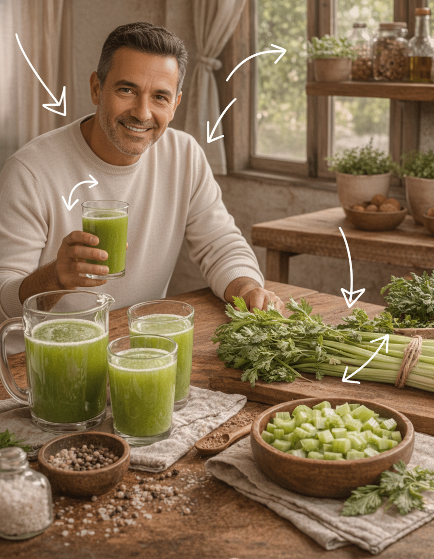 8. Contribuye a una hidratación subconsciente y efectiva Imagina una tarde calurosa, sintiendo sed, cansancio y un deseo incontrolable por algo salado. Es frecuente que, en lugar de agua o alimentos frescos, muchas personas opten por bebidas azucaradas o aperitivos poco saludables. El apio, al estar compuesto en gran parte por agua, se convierte en un excelente complemento para mantener una hidratación adecuada como parte de una dieta balanceada. Si bien no sustituye la ingesta de agua pura, sí suma considerablemente, especialmente cuando se consume en meriendas o se integra en batidos caseros. Tomemos el ejemplo de “Carmen”, una mujer de 56 años que comenzó a llevar apio troceado con un poco de limón a su oficina. Lo primero que notó no fue una “transformación milagrosa”, sino una disminución significativa de los antojos por snacks pesados durante la tarde. Esta pequeña y consciente decisión fue el punto de partida para mejoras más profundas en su bienestar.