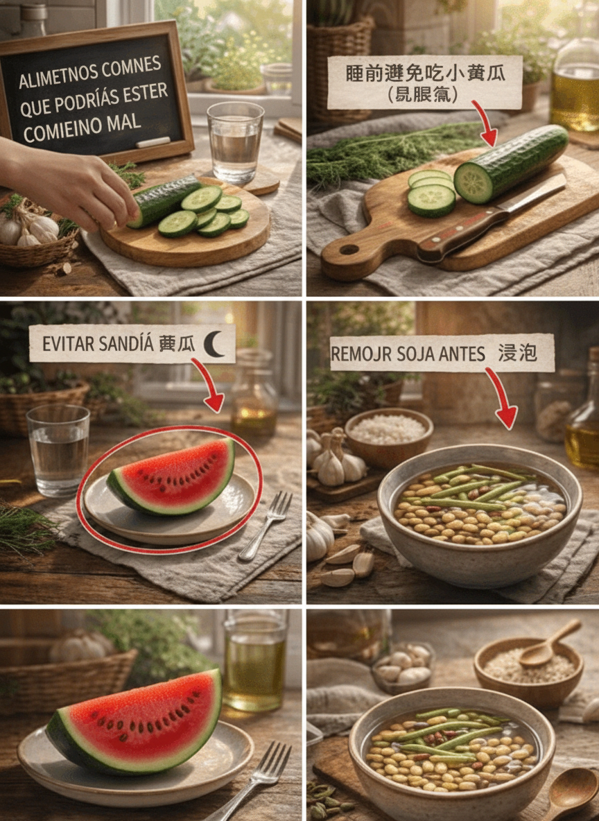 El pepino es valorado por su bajo aporte calórico y su gran cantidad de agua, considerándose una opción saludable y refrescante. Sin embargo, su naturaleza “fría” (según la medicina tradicional) lo hace menos adecuado para el consumo nocturno. Comer pepino antes de dormir puede resultar en hinchazón, exceso de gases e incluso afectar la calidad de tu sueño. Es preferible incorporarlo a tu dieta durante el día o en el almuerzo, cuando tu sistema digestivo está más activo y puede procesarlo eficientemente.
