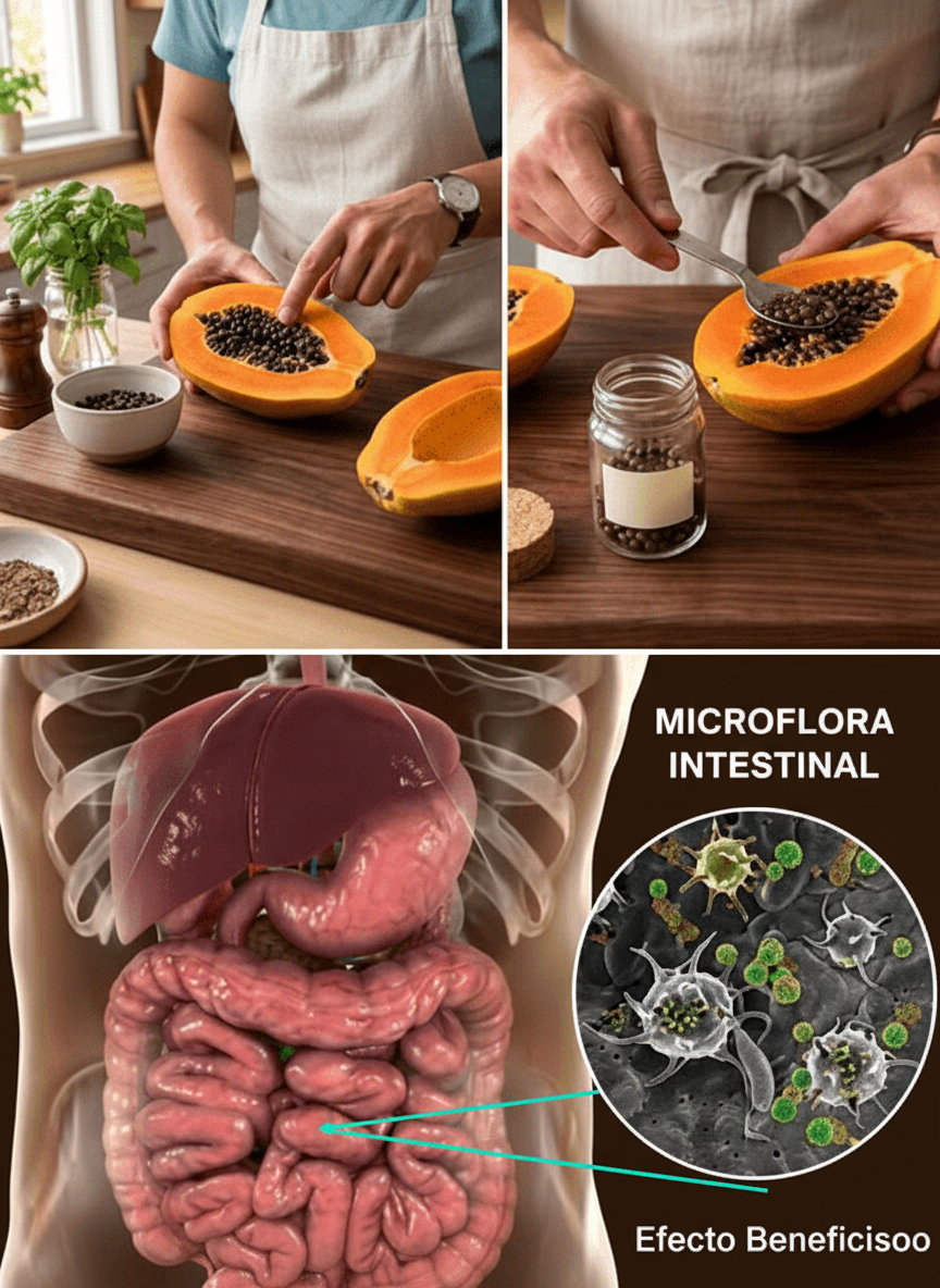 Históricamente, en la medicina tradicional de Asia y América Latina, las semillas de papaya han sido utilizadas para mantener un intestino “limpio”. Investigaciones de laboratorio contemporáneas confirman sus suaves propiedades antibacterianas y antiparasitarias. Si sientes que tu microbiota intestinal está desequilibrada, quizás después de un viaje o de consumir alimentos poco habituales, un puñado de estas semillas podría ser tu remedio natural para restaurar el balance.