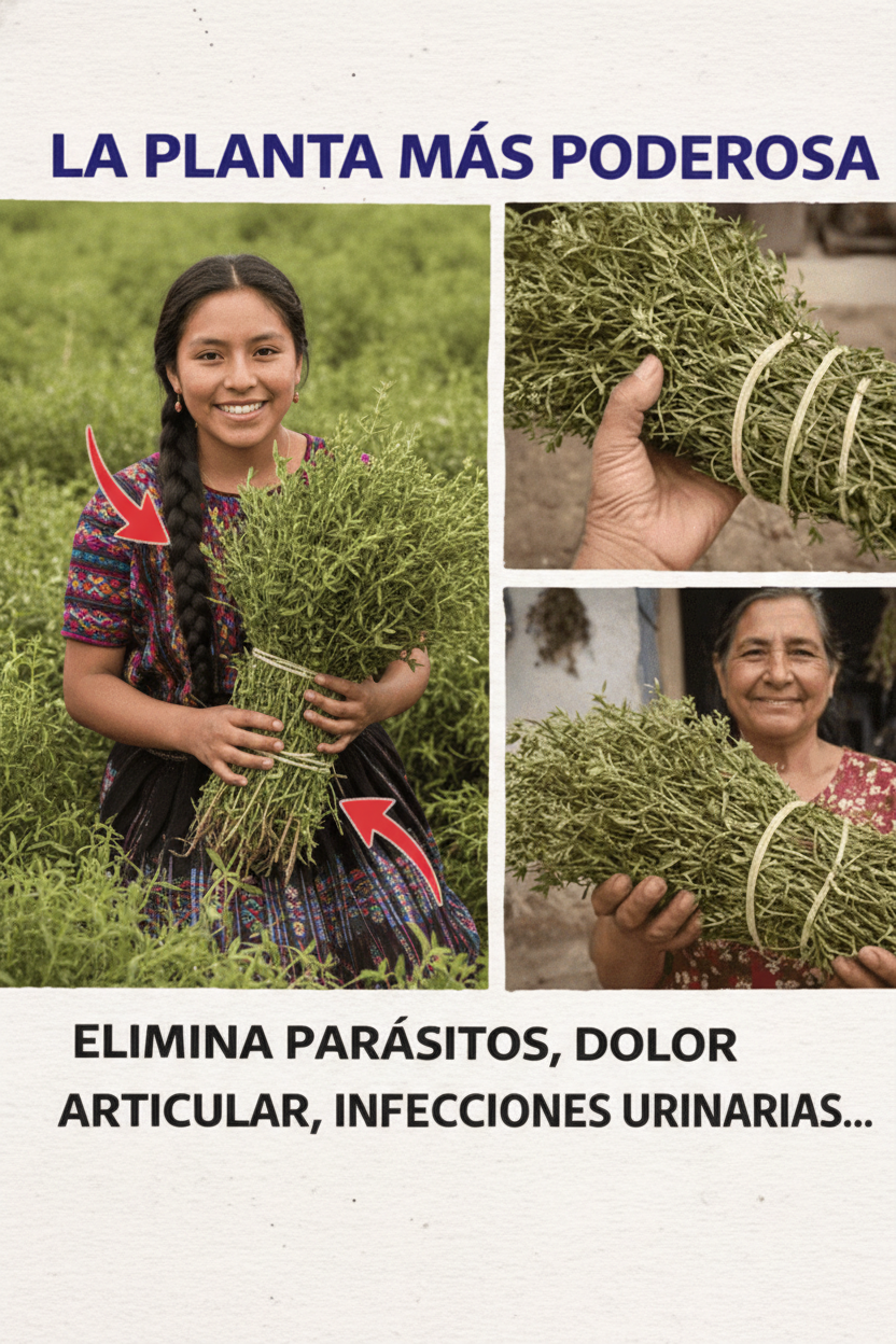 La planta en la imagen parece ser una hierba tradicional mexicana usada en medicina popular, probablemente epazote (Dysphania ambrosioides, antes Chenopodium ambrosioides), conocida por sus usos contra parásitos intestinales, problemas digestivos y en algunos contextos tradicionales para apoyo en malestares urinarios o inflamatorios. Otras posibilidades incluyen ruda o hierbas similares en manojo, pero el epazote encaja bien con el manojo verde atado, usos antiparasitarios y tradición mexicana rural.