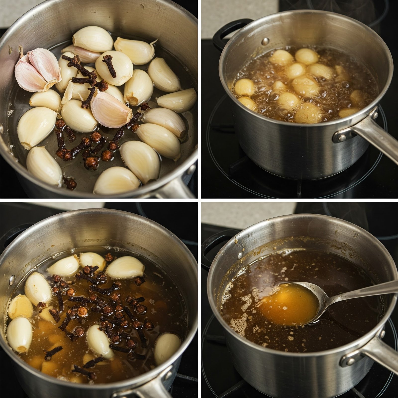 Add 300 ml of water to the pot with the garlic. Drop in 4–5 whole cloves (not ground). Bring to a light simmer, then remove from heat immediately. High heat can damage the delicate active compounds.