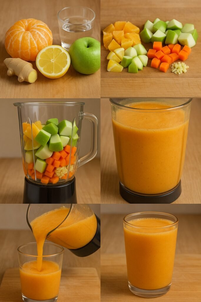 Blend everything—orange, lemon, apple, carrot, ginger, and water—until smooth.